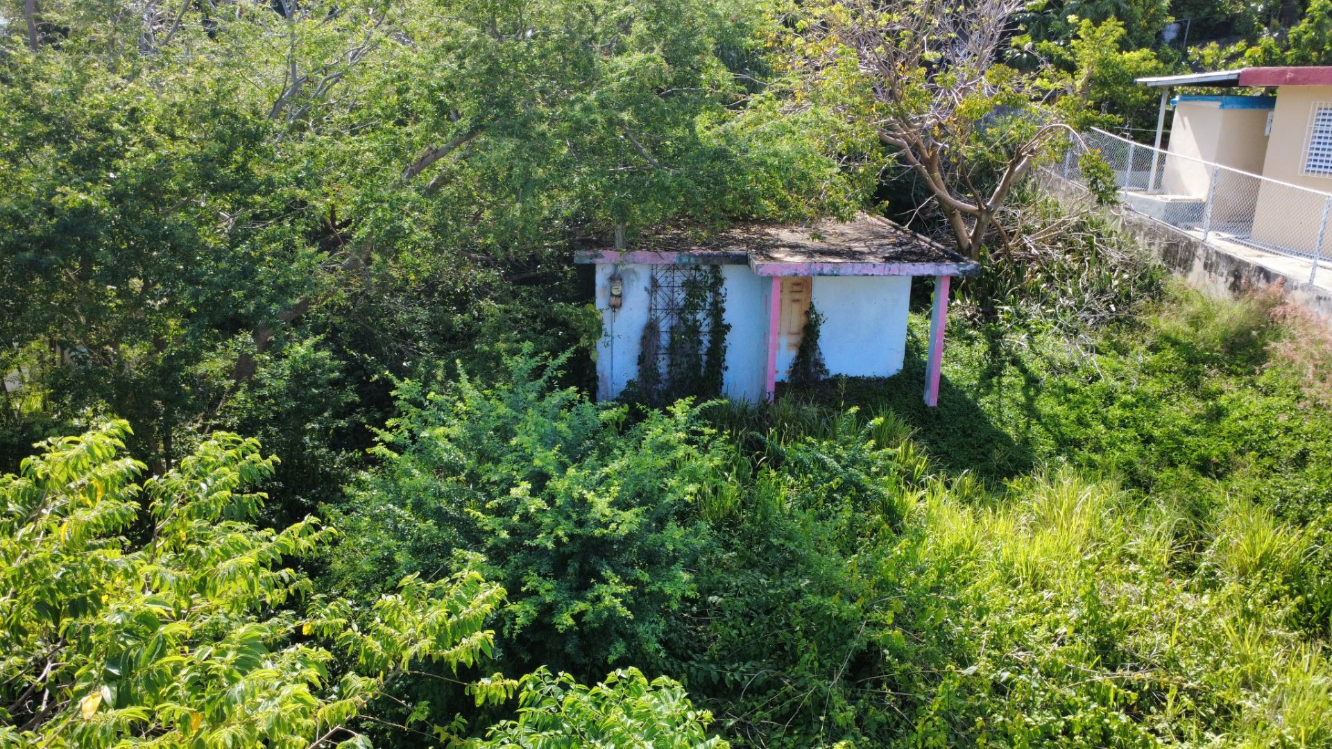 Property abandoned for over 10 years. The entire lot is covered by completely uncontrolled vegetation — large trees have grown over and through the roof and walls of the existing structure. The property hosts a large colony of invasive green iguanas (Iguana iguana), declared a pest by the Puerto Rico government, posing a salmonella risk to neighbors. The dense vegetation has created a massive mosquito breeding ground, making it impossible for the immediately adjacent residents to be outdoors. Those residents are Catalina Burgos, age 100, and Carmen Pinott, age 77 — two elderly women in vulnerable health condition who are directly harmed every day by this situation. The property is registered to Ministerio Codech en Avance, Inc. (Dept. of State #26692), a non-profit religious organization that has had no active operations for years. CRIM cadastral number: 353-099-718-12-000.
